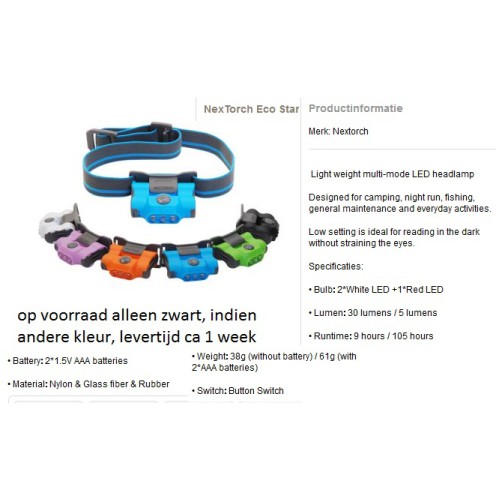 hoofdlamp, met 2 witte en 1 rode led, aanrader voor Veva en outdoor, Nextorch eco star