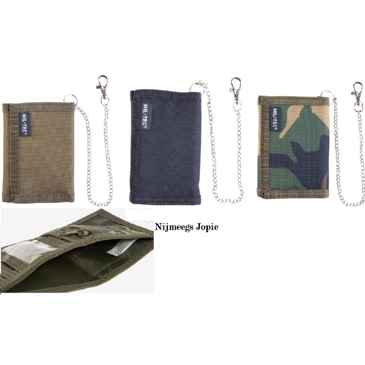 mooie stevige portemonnee, met diverse vakjes, ook afsluitbaar muntgeld-vakje, met ketting, meestal voorradig in groen, zwart en woodland-camouflage